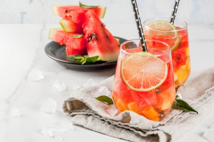 2. اخلطي المزيج في إبريق وأضيفي عصير الليمون وعصير البطيخ وعصير الأناناس.