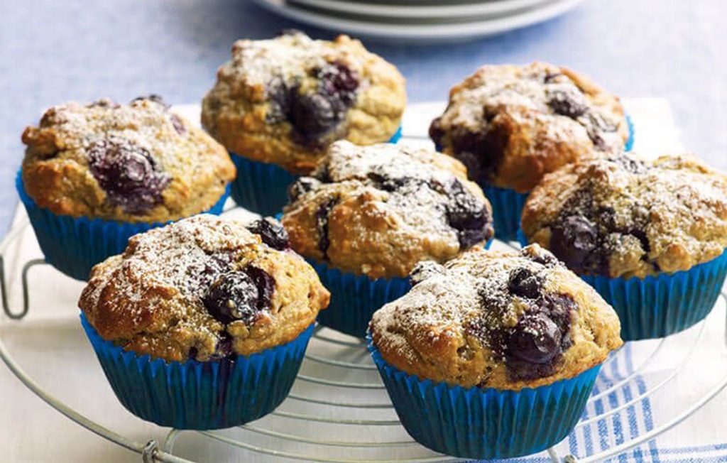 ٤. قسم الخليط على أكواب المافن ورش باقي التوت الأزرق فوقها. اخبز لمدة ٢٠-٢٥ دقيقة، أو حتى يخرج عود الأسنان نظيفا عند إدخاله.