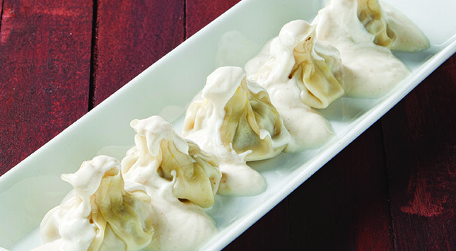 يُخلط الثوم المفروم مع اللبن الزبادي ويوضع الخليط جانبًا.