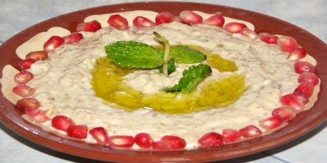 - إسكبي متبّل الباذنجان في طبق التقديم وزيّني وجهه بالرمان وزيت الزيتون بحسب رغبتك .