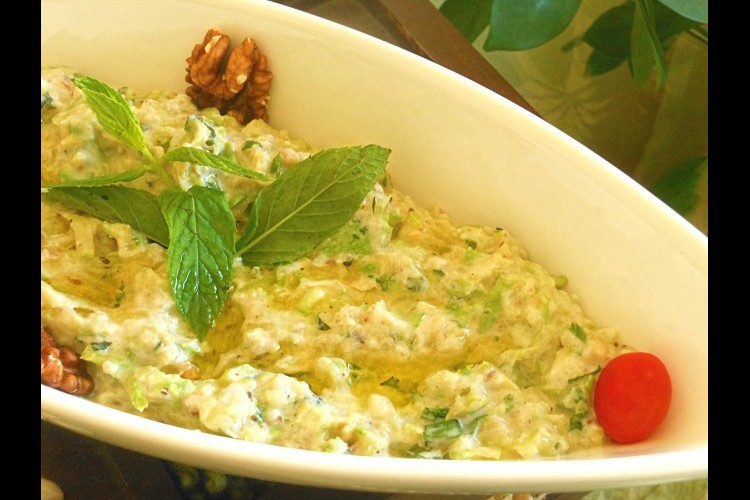 2. نخلط اللبن وزيت الزيتون والثوم والجوز والشبت والنعنع والملح والفلفل ثم نضع فوقها الكوسا المبشورة ونضعها في صحن التقديم وتزين بحبات الجوز والبندورة الكرزية وعود نعنع طازج