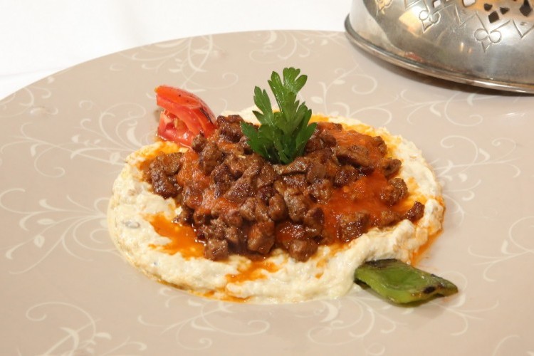 3. طريقة التقديم: يُفرد خليط الباذنجان الممزوج مع الزبادي في طبق التقديم، ويوزَّع خليط لحم الضأن على السطح. يقدَّم الطبق ساخنًا.