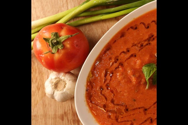 3. تهرس الطماطم مع الثوم والنعناع، ويضاف الملح، والفلفل الأسود وتزين بزيت الزيتون.