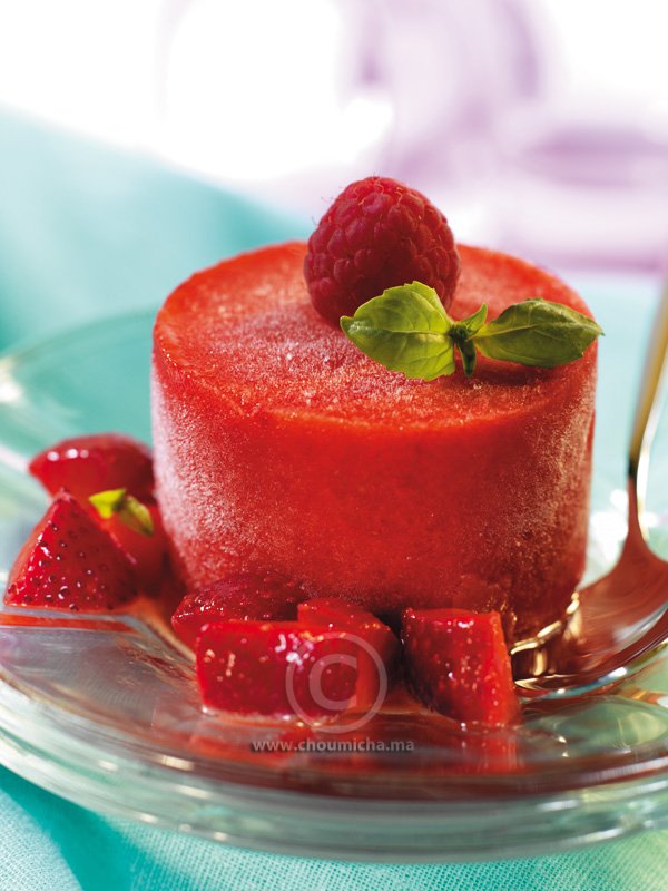 • تزال المثلجات من القوالب وتقدم مصحوبة بقطع الفراولة و مزينة بتوت العليق (فرامبواز) وأوراق الريحان .