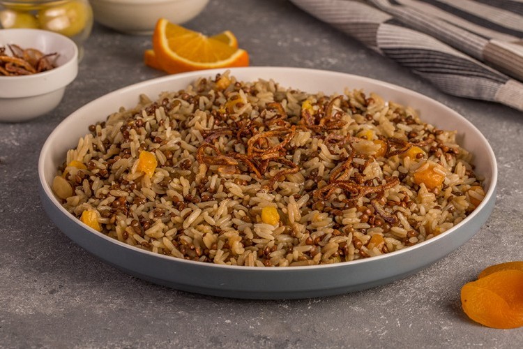 3. في القدر المُستخدمة لقلي البصل (من دون تنظيفها)، تُضاف بذور الكمُّون الصحيحة، مع التقليب سريعًا، فالمشمش المجفَّف، مع الاستمرار في التقليب، وذلك على نار هادئة. ثمَّ، يُضاف العدس المغسول والمُصفَّى، ويقلَّب مع المشمش والكمُّون. يُصبُّ الماء، فتُغطَّى القدر، وتُدع على نار هادئة لـ15 دقيقة. يُضاف الأرز والملح وعصير البرتقال، فتُخفَّف الحرارة، ويُترك الخليط على نار هادئة لعشرين دقيقة. يُقدَّم هذا الطبق ساخنًا، ويُزيَّن بالبصل المقلي.
