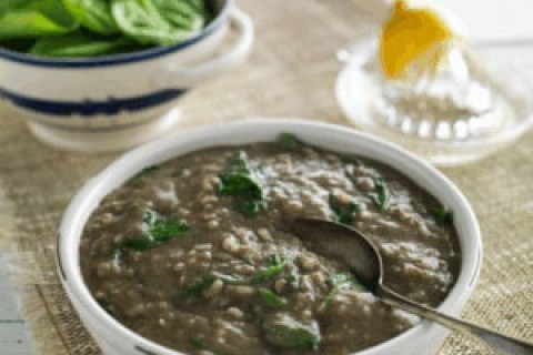 - يُرفع المزيج عن النار ويُحرّك مع أوراق السبانخ. تُترك الأوراق لتذبل لمدّة خمس دقائق. ثمّ، يُضاف عصير الليمون الحامض ويُحرّك ويُقدّم.