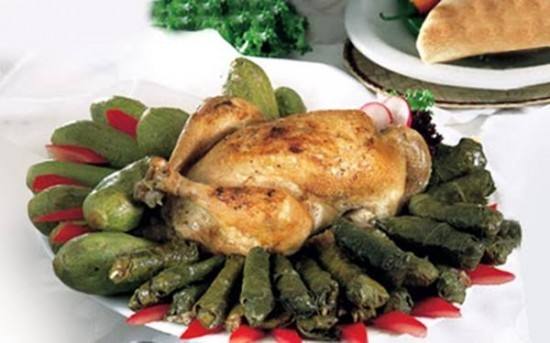 - توضع الدجاجة وسط طبق تقديم كبير، وويرصف حولها الكوسة وورق العنب المحشو .
