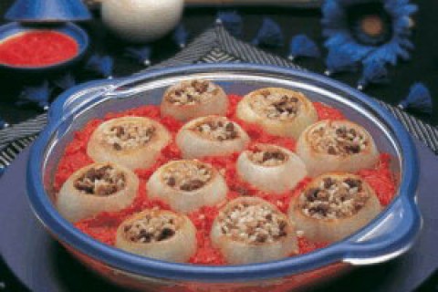 - تُقشّر أكواز البصل وتُغلى حتّى تذبل. ثم تُنزع كلّ طبقة من البصل بتأنٍّ وتُترك جانباً.