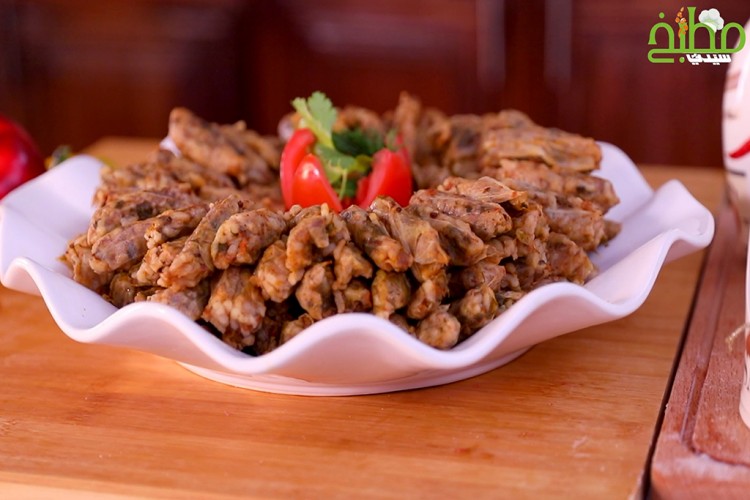 1. تشويح اللحم المفروم مع السمن، إضافة البصل ثم الطماطم.