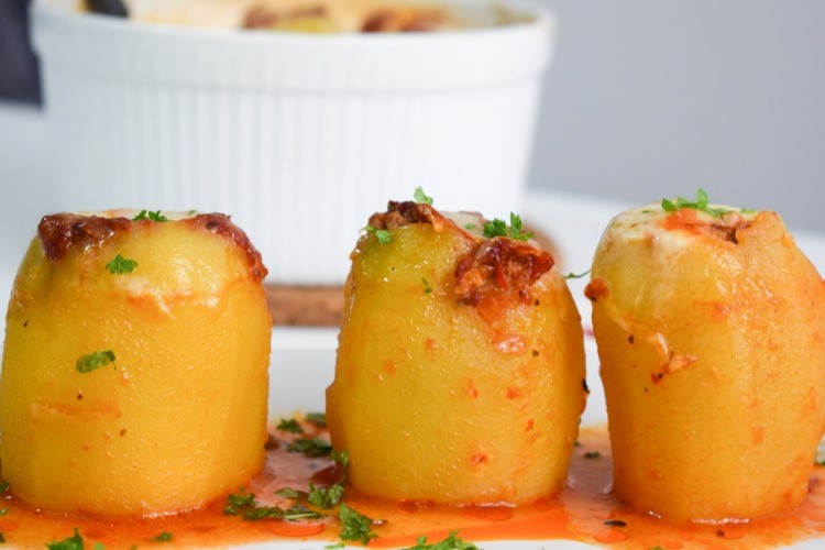 5- احشي حبّات البطاطس بمزيج اللحم ثمّ ضعي في كلّ رأس فصّ ثوم.