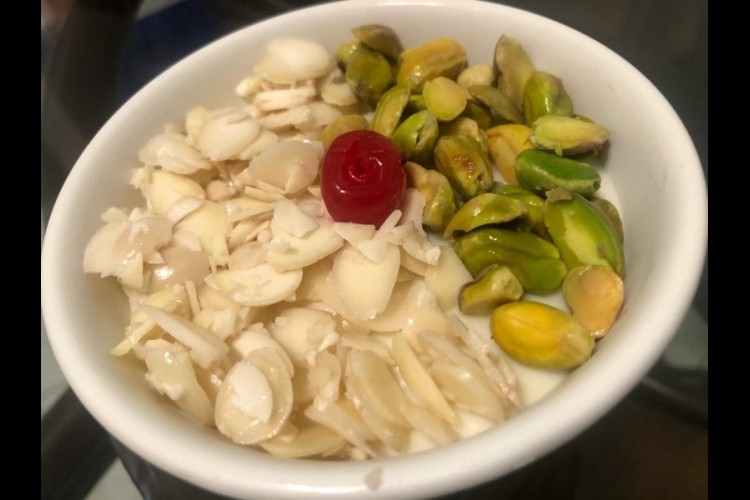 - نحرك مدة خمس دقائق ثم نطفئ النار ويسكب في زبادي ويترك ليبرد ثم يزين بالمكسرات.