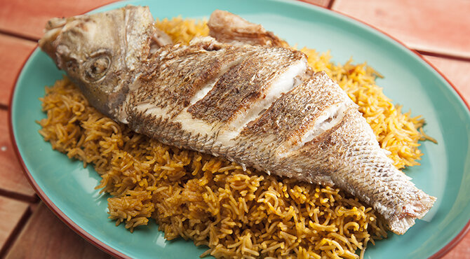 تضاف البهارات ومرق السمك ويغلى، يضاف الأرز ويغطى وتخفض الحرارة ويطبخ لـ15-20 تقريباً.