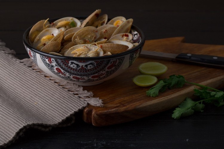 - يُسخَّن الزيت والزبدة، في قدر على النار، ويُقلَّب فيها الثوم والفلفل الحار (في حال استخدامه)، جيِّدًا. يُضاف صدف البحر، مع التقليب جيِّدًا.