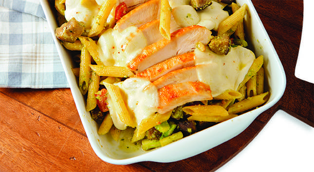 يخلط الصوص مع الخضروات وباستا البيني ويصب في الصينيه، ثم يرص الدجاج على الوجه.