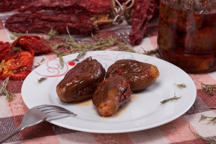 - اصنعي شق بواسطة سكين حادة في حبات الباذنجان واحشي الباذنجان بحشوة الفلفل.