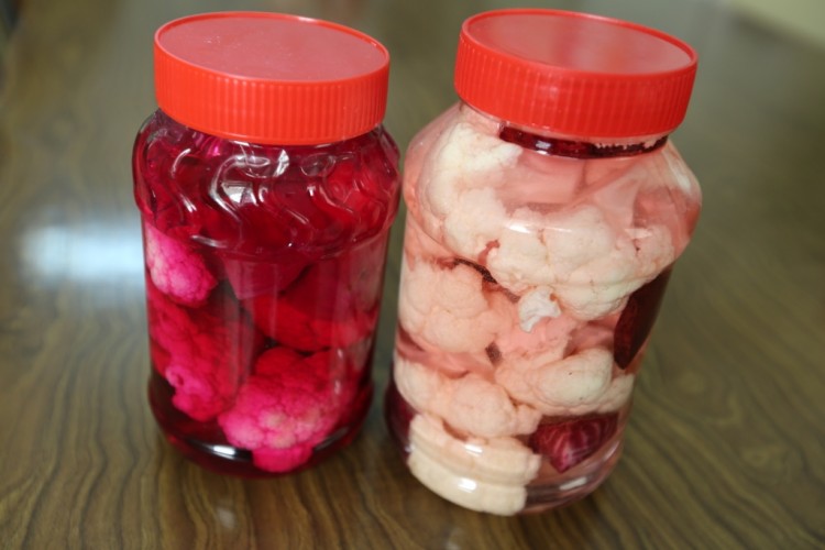 1. لتحضير مخلل الزهرة: ذوبي الملح والسكر والخل بأكواب الماء، ضعي الشمندر وزهرات القرنبيط ببرطمان الحفظ، وصبي الماء، وأغلقي بإحكام، ويترك لمدة أسبوعان حتى ينضج.