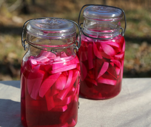 4. توضع شرائح من الشمندر بين طبقات اللفت حتى تعطي الكبيس اللون الأحمر.