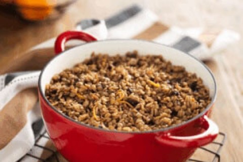 - ثمّ، يُضاف الأرزّ المنقوع والبهارات وقشر البرتقال ويُحرّك المزيج لبضع ثوانٍ. يُضاف كوبان ونصف أو 625 مل من مرقة العدس المتبقية والعدس المغلي.