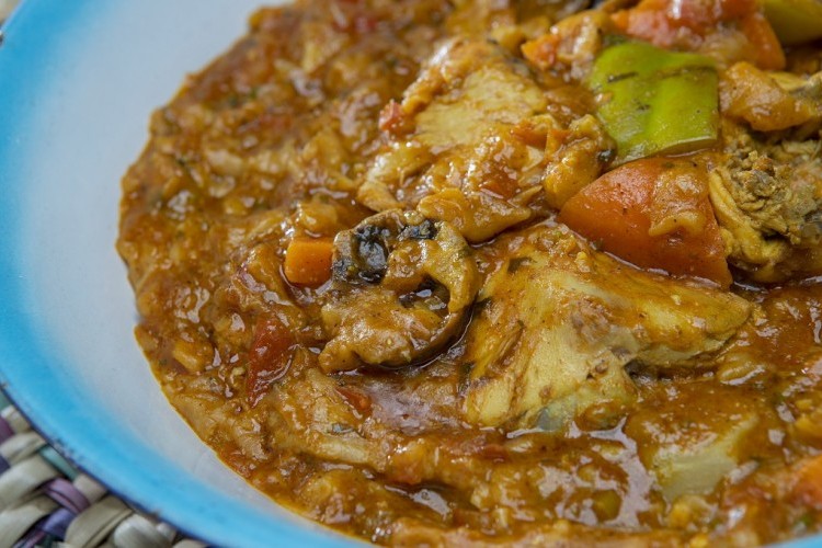 - تضاف الخضراوات وتقلب مع التوابل، ومعجون الطماطم، ثم الماء المغلي والكزبرة الخضراء، ويغطى الوعاء ويترك حتى ينضج الدجاج.