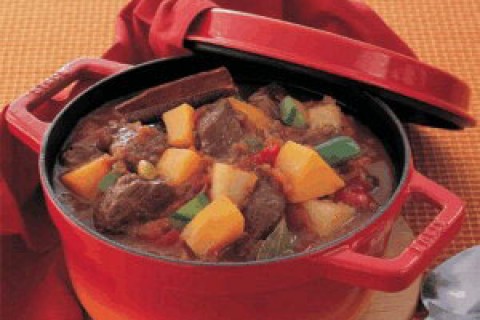 - تُضاف الفليفلة الحلوة، والكوسا، والثوم، واليقطين، والبطاطا، والهال، ومكعّبا مرقة البقر ماجي والفلفل الأسود، وتُطهى المكوّنات لمدة 15 دقيقة إضافية أو حتى ينضج اللحم والخضار.