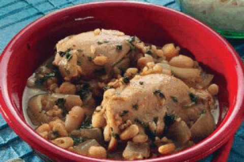 4. توضع قطع الدجاج من جديد في القدر، وتُطهى لمدّة 40 دقيقة أو حتى تنضج قطع الدجاج وحبوب الفريكة.