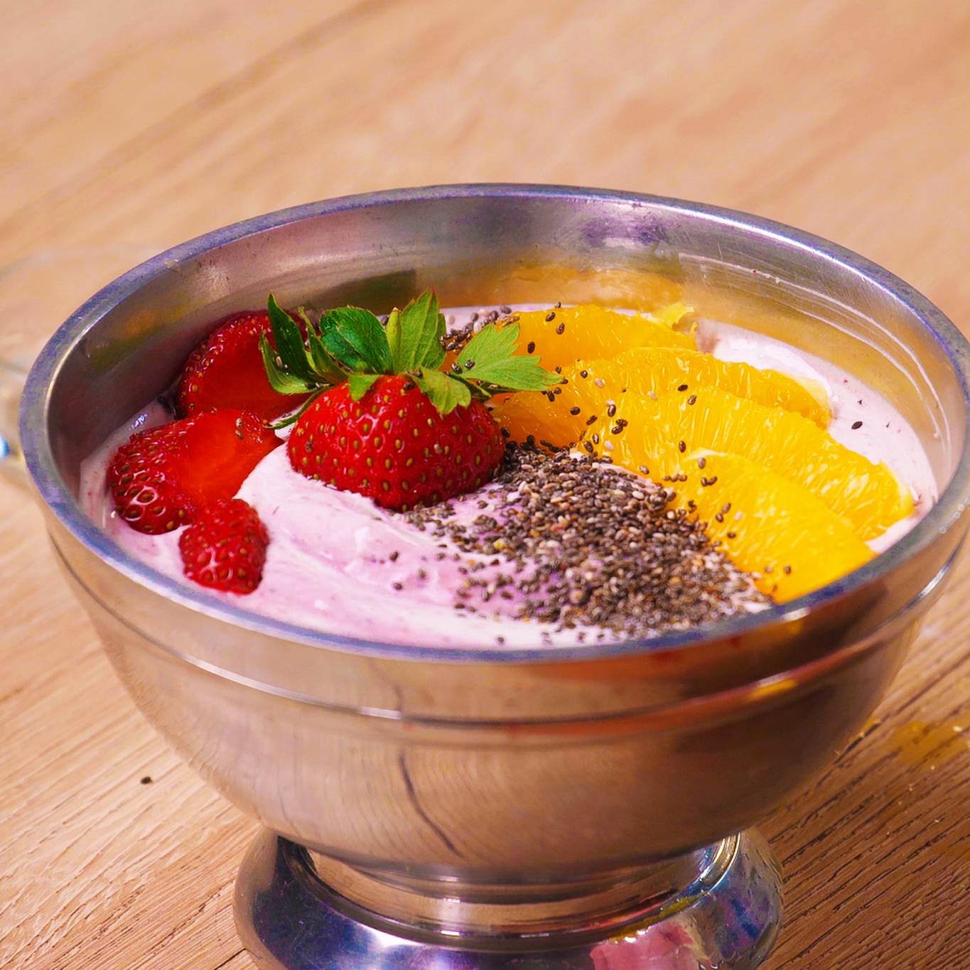 يقدم في وعاء وفوقه الفراولة والبرتقال وبذر الشيا