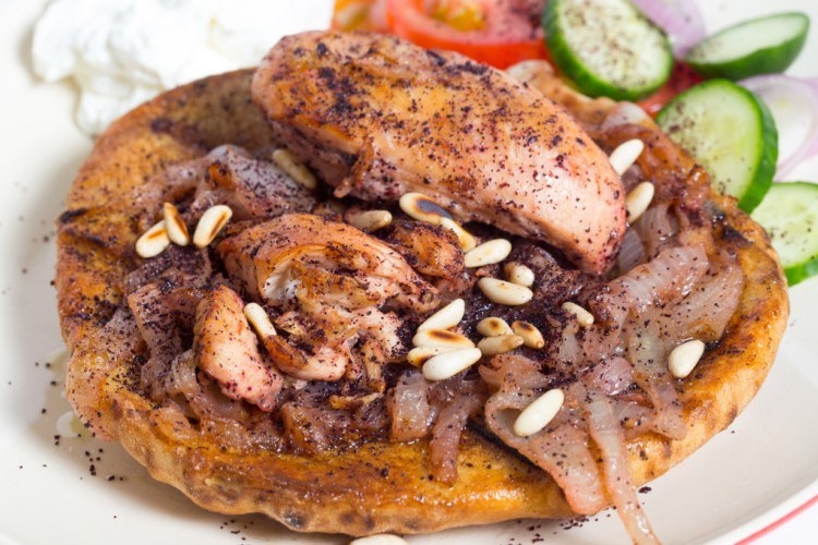 5. نحضر خبز الطابون، ويغطس بزيت البصل، ويرص في صحن التقديم، ثم يضاف البصل على الرغيف المغطس بالزيت ثم نضيف السماق ثم المكسرات، ونكرر العملية حتى تنتهي طبقات الخبز.