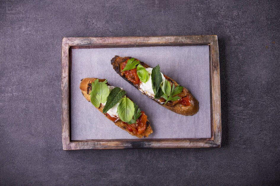 يوضع خبز التوست على صحن التقديم وتدهن كل شريحة خبز توست بالكثير من المسقعة وعلى الوجه يوضع جبنة البوراتا والأعشاب.