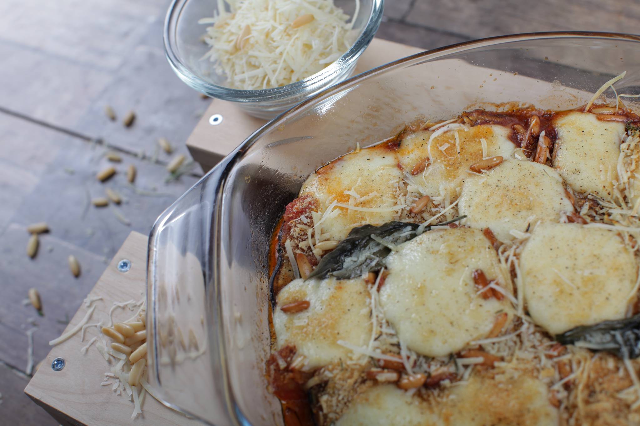 في صينيه فرن كبيره نحط ملعقتين صلصه في القعر وعليهم طبقه باذنجان وملح وفلفل وبعديها طبقه صوص وقطع الموزاريلا والبارميزان والريحان المقطع نكرر الطبقات وعلي الوش صلصه ونحط خليط البقسماط والبارميزان والصنوبر ونخبزها في فرن متوسط درجه حرارته 180 لمده 30الي 40 دقيقه لغايه مالوش ياخد لون ذهبي.