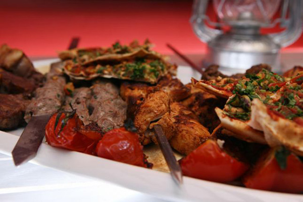 2. تقدّم المشاوي المشكّلة ساخنة، ويزيّن الطبق بأرغفة الخبز العربي مع الطماطم المشوية والبصل المشوي وأوراق البقدونس الأخضر.