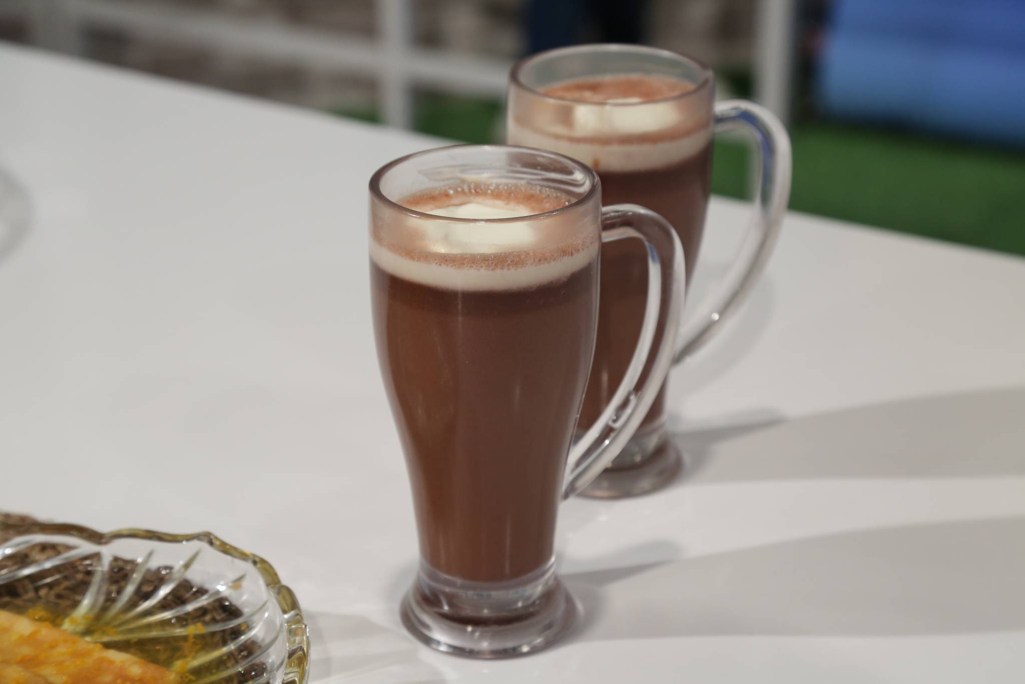 تسكب الشوكولاته الساخنة في الاكواب وتزين بالكريما المخفوقة ورشة من الكاكاو