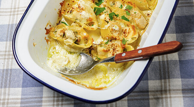 معكرونة الأصداف بالدجاج والصلصة البيضاء