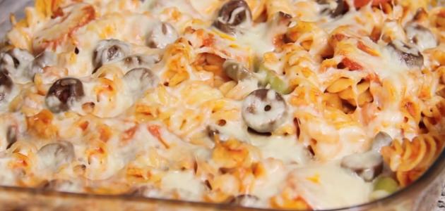 2- في صينية، ضعي المعكرونة ووزعي فوقها صلصة البيتزا.