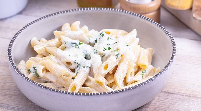 يغلى الماء المملح في قدر كبير، تضاف معكرونة البيني وتطهى حتى تسلق وتصبح شبه مسلوقة، ثم تصفى.