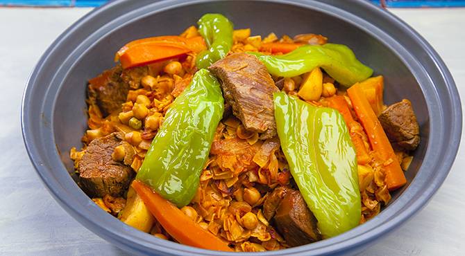 تغمر بالماء وتطهى على نار هادئة لمدة 50-60 دقيقة حتى ينضج اللحم.