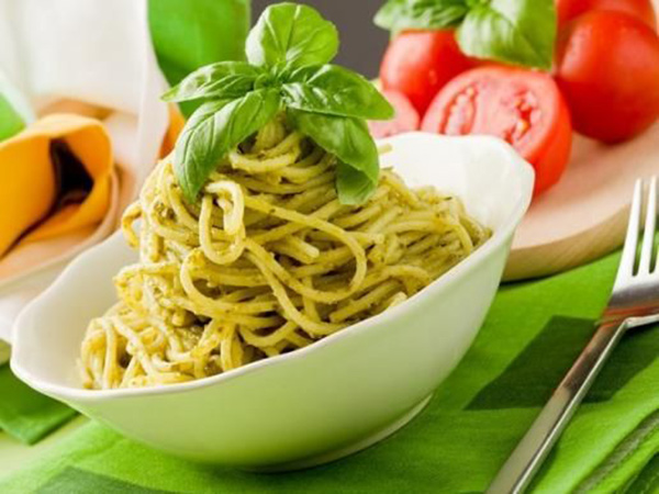 5. يقلّب اللحم بزيت الزيتون على النار، وتطهى المعكرونة بالماء المغلي، توضع المعكرونة في طبق التقديم، ويضاف لها صلصة البستو وكريما الجزر، ويزيّن هذا الطبق باللحم.