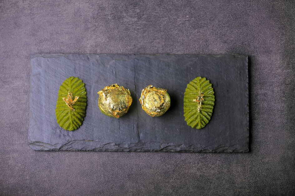 تقسم عجينة الفستق الحلبي المفروكة إلى كرات صغيرة.