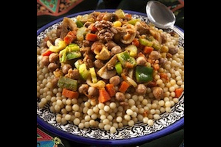 3.  في الوقت عينه، في قدر سميكة القاعدة ضعي المغربية والسمن، وقلبي على النار لمدة دقيقة أو دقيقتين، وأضيفي المرق، غطي القدر وأبعديها عن النار، قلبي المغربية بالشوكة لكي تتفتح الحبات جيداً، وأضيفي المزيد من المرق إذا بقيت المغربية جافة. يجب أن تتفتح حبات المغربية تماماً، وتلين.