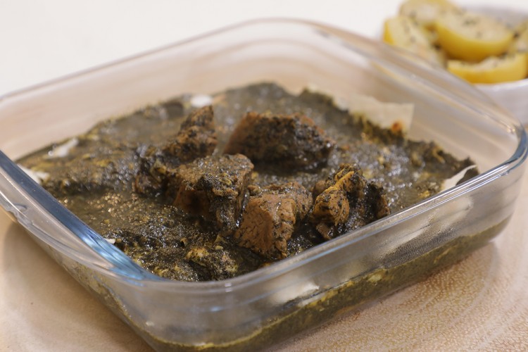 - ضعي خبز الرقاق بقاع طبق التقديم، وسقيه بالملوخية واللحم.