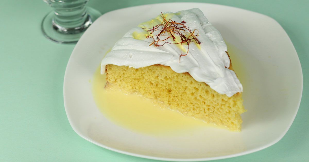 9- أخرجي كيك الزعفران من الفرن ثم اثقبيه وأسكبي خليط الحليب المبخر على وجهه.