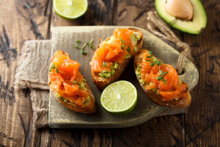 - وزعي الأفوكادو فوق الخبز المحمص ثم وزعي السلمون المدخن.