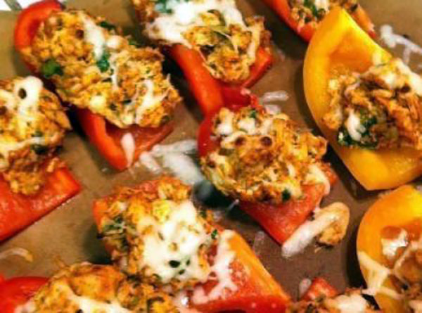 4. تمتص الرطوبة الزائدة من الفلفل بمناشف ورقية، إذا لزم الأمر. باستخدام مغرفة صغيرة، تملأ أسافين الفلفل بالخليط.