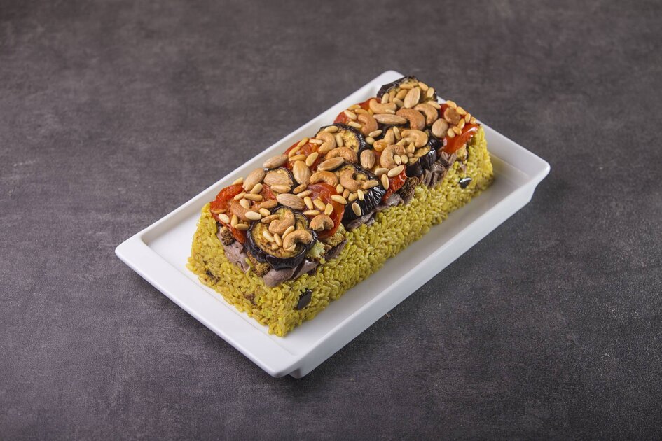 في قالب كيك مستطيل الشكل يوضع اللحم والخضار، ثم الأرز وتضغط المكونات برفق للداخل