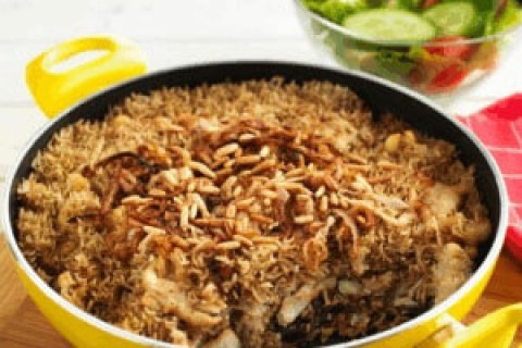 7. للتقديم، يُقلب محتوى القدر رأساً على عقب في طبق كبير، ويُزيّن الطبق بشرائح البصل المقليّة وبذور الصنوبر ويُقدّم ساخناً.
