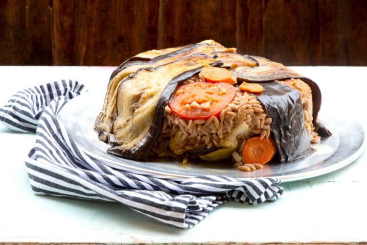 - وزّعي الباذنجان ثم الفليفلة الخضراء والحمراء ثمّ البازيلاء والحمص.