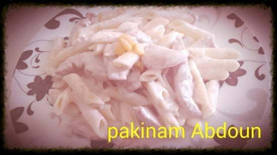 - فی نفس المقلاة نضع ملعقة الزيت الثانية وننزل ملعقة الدقيق ونقلبهم وننزل بالكريمة واحدة واحدة ونقلب بمضرب السلك وننزل اللبن ونتبلها بملح وننزل فيها الدجاج ونتركهم يغلى غلوة واحدة وننزل المكرونة ونقلبهم.