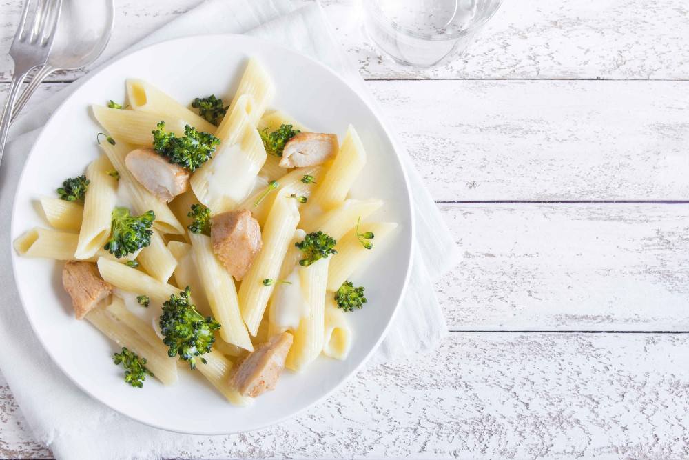 - يضاف البروكلي والدجاج وقليل من زيت الزيتون إلى المكرونة، وتقلب جيداً.