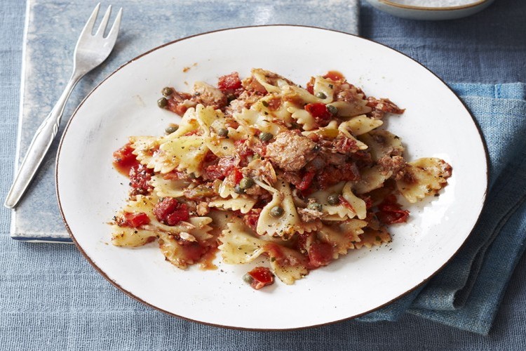 2. تخلط المكرونة، في وعاء، مع الصلصة، والتونا والكبر، جيِّدًا.