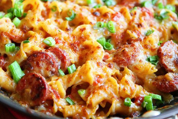 5. يتم خلط السجق مع المكرونة ثم وضعه في صينية.