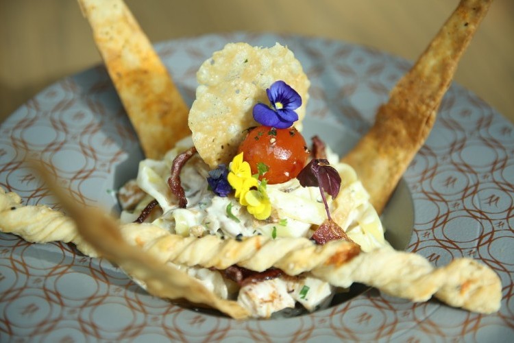 8. توضع الباستا في وعاء المعكرونة والزينة وتزيّن بعصي الخبز، والطماطم الكرزية والأوراق الخضراء والبارميزان.